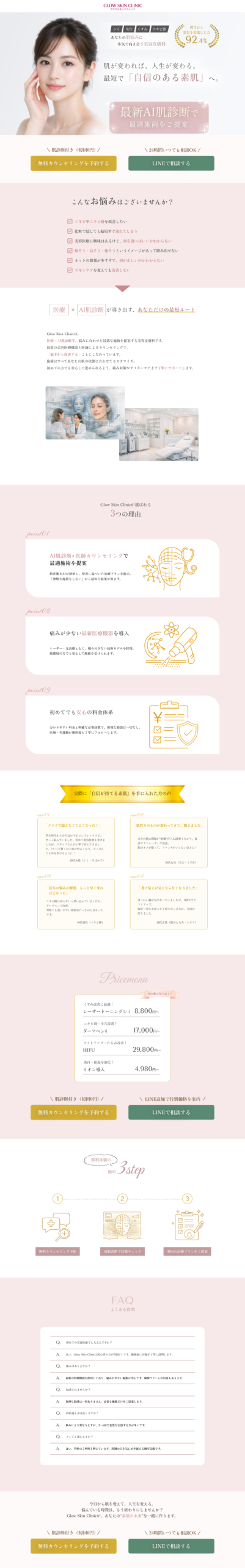 また、ユーザーの心理的ハードルを下げるため、公式LINE相談とWEB予約の2つの導線を設置し、コンバージョンも意識しました。LINEボタンはブランドの世界観を壊さないよう、あえて「くすみグリーン」を採用し、高級感とクリック率の両立を図りました。